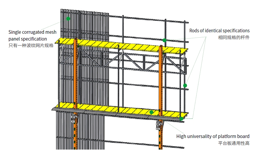 - انخفاض تكاليف التفكيك والنقل والعمالة بسبب الإطار خفيف الوزن مقارنة بمنصات التسلق الفولاذية العادية.